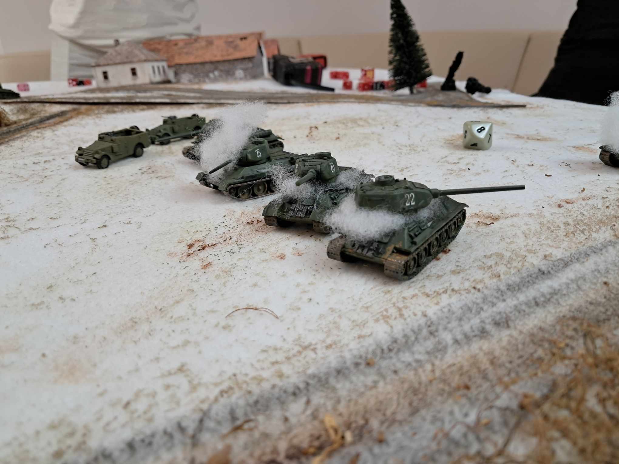 Przykładowo stosunkowo świeży sPzAbt 509 wystawił w pewnym momencie tylko trzy sprawne Tygrysy II. Siły rosyjskie również były wówczas mocno przetrzebione. Rejonem walk było miasteczko Baracska oraz wieś i stacja Pettend, położone przy drodze i torach kolejowych z Kapolnasyek nad brzegiem Jeziora Velence do Budapesztu. Rozciągające się wokół Pettend równiny stały się areną zaciętych walk pancernych, w wyniku których sowieckie 1 Korpus Zmechanizowany Gwardii, V Korpus Kawalerii Gwardii, a przede wszystkim rzucony do kontrataku świeżo odbudowany 23 Korpus Pancerny poniosły ogromne straty, głównie w broni pancernej. Siły niemieckie tzn IV Korpus Pancerny SS który obok tradycyjnych 3 DPanc SS Totenkopf i 5 DPancSS Wiking miał w tym czasie jeszcze podporządkowane 1 DPanc gen Thunerta, 509 sPzAbt z czołgami Tiger II Ausf B, oraz I Batalion 24 Pułku Pancernego z 24 DPanc z czołgami Panther. Oczywiście nie mieliśmy na stole wszystkich tych jednostek, ale biorąc pod uwagę ich ówczesny opłakany stan liczebny to mieliśmy całkiem pokaźną ich reprezentację. Np batalion z 23 P.Gren Panc Norge stubaf Vogta liczył na początku tych walk już tylko ok 120 żołnierzy, a po bitwie o Pettend stopniał do zaledwie 80 ludzi. 1 K.Zmech Gwardii miał na początku stycznia ok 180 czołgów M4A2 Sherman, ale na poczatku lutego już tylko 47 czołgów. Jeszcze gorzej poszło 23 KPanc, 25 stycznia przed wejściem do walki w korpusie było 174 czołgi T34, a 1 lutego zostało w nim już tylko 13 czołgów. Korpus ten w ciągu zaledwie kilku dni został praktycznie rozstrzelany w tej bitwie, przede wszystkim za sprawą Tygrysów Królewskich z 509 Batalionu Czołgów Ciężkich.