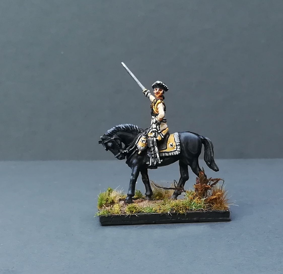 Długo przygotowywałem się na moment, w którym przystąpię do budowy armii z wojny siedmioletniej. Kluczowym warunkiem było tu posiadanie odpowiednich figurek kirasjerów.Pozostałe formacje jako tako są reprezentowane przez zestawy Revell, HaT czy Zviezda. Niestety jak dotąd w ofertach plastikowych zestawów 1/72, kirasjerzy jakiejkolwiek armii SYW wciąż się nie pojawili. Trzeba więc było zakasać rękawy i poradzić sobie własnym pomysłem i sumptem. Trochę pracy w Green Stuffie plus kombinacja części plastikowych zestawów, odlewanie w żywicy, a potem w metalu i oto są. Projekt nie jest robiony komercyjnie, a wyłącznie na własne potrzeby. Na razie planuję pomalować trzy regimenty pruskich kirasjerów. Na początek wybrałem regiment Georga Philippa Gottloba Barona von Schönaich. Sięgał on swoimi tradycjami do 1688 r. Uczestniczył wojnie o sukcesję hiszpańską a kilkadziesiąt lat później, austriacką kiedy to walczył m.in w bitwie pod Kesselsdorf w 1744. W wojnie siedmioletniej wziął udział w wyprawie Fryderyka II do Saksonii i w 1756 w bitwie pod Lobosicami, walcząc w brygadzie gen. Wilhelma von Driesen. W następnym roku kirasjerzy barona von Schönaich wzięli udział w inwazji pruskiej na Czechy. Walczyli w największej bitwie tej epoki pod Pragą, a następnie w katastrofie pruskiej pod Kolinem. 22 XI 1757 r regiment wziął udział w kolejnej przegranej przez Prusaków bitwie pod Wrocławiem. Pod koniec tego roku w bitwie pod Lutynią regiment zdołał się zrehabilitować udanie szarżując przeciw grenadierom austriackim, walnie przyczyniając się do pruskiego zwycięstwa.